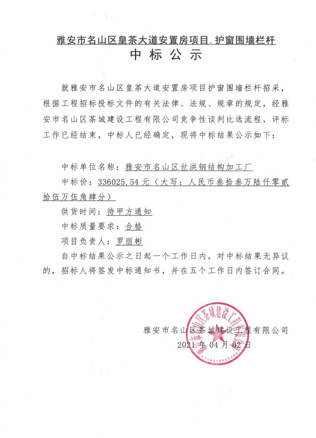 雅安市名山區(qū)皇茶大道安置房項目護窗圍墻欄桿中標公示